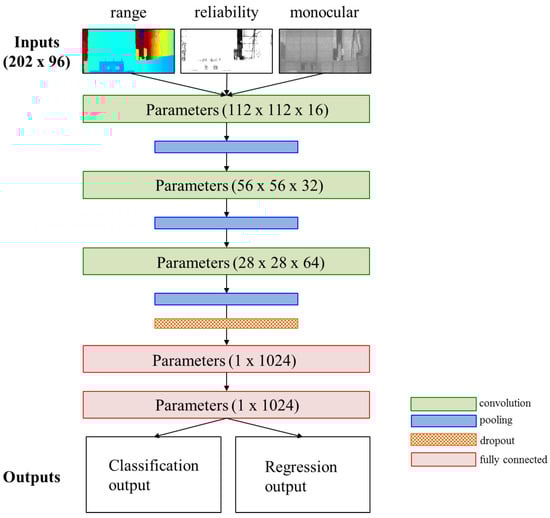 Figure 6 shows our DCNN model, which consists of three convolution operations, three pooling operations, one dropout operation, two fully-connected operations and two kinds of outputs. Detailed descriptions of each operation are given in [29]. The DCNN input is our SPAD LIDAR data. The size of each input is 202 × 96 pixels. The DCNN has two kinds of output. One set of output data is the classification results. The classification task of this model is to classify whether a target is in sight of the FOV. For example, in an AGV application, the target is a pallet that the AGV is required to approach. The other output data are the regression results. The regression results are the 3D position and orientation of the SPAD LIDAR.