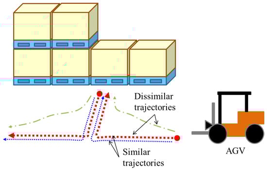 Assumed scenario for evaluation. An AGV moves to the target along various paths. The trajectories are similar in some cases and dissimilar in others.