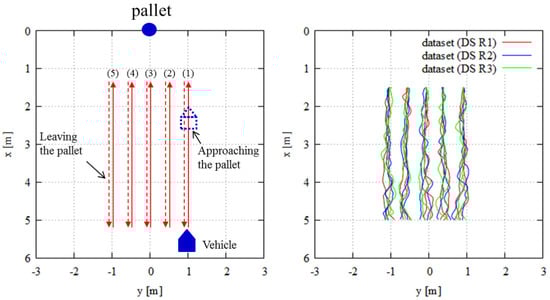 This experiment investigated the benefits of SPAD LIDAR outputs compared to those of conventional LIDAR, which employ range data only. Figure 9 (left) shows an overview of the trajectories. These trajectories were assumed to be the typical path of the AGV in the factory. In many cases, the AGV moves along similar paths to perform the task. Therefore, we evaluated the basic localization performance for those trajectories. In this experiment, the vehicle directly approached a pallet and then departed from the pallet repeatedly. In Experiment 1, the pallet was always in sight. Figure 9 (right) shows the ground truth trajectories collected by motion capture. We used Datasets 1 (DS R1), 2 (DS R2) and 3 (DS R3) shown in Figure 9 (right). When evaluating “R1”, we used DS R1 for localization error evaluation and DS R2 and DS R3 for the training step to create the DCNN model. The evaluation and training step data for the evaluation of “R2” were DS R2 and DS R1 and DS R3, respectively. For the evaluation of “R3”, DS R3 was used for evaluation, and DS R1 and DS R2 were used for the training step.