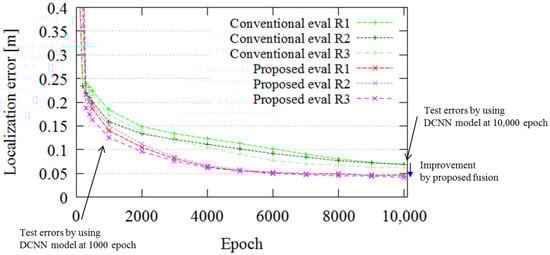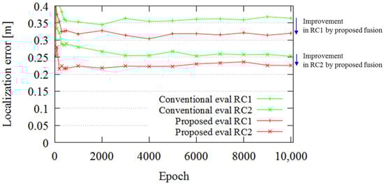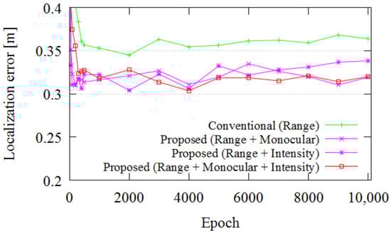 Figure 10 portrays the localization errors obtained using the two approaches, “Proposed (SPAD DCNN)” and “Conventional”, for all experiments. In Figure 10, one epoch on the x-axis means one step of the training procedure for the entire dataset. The y-axis shows the localization error calculated in terms of the ATE, which is defined in Equations (2) and (3). The ATE evaluates the trajectory consistency, which is important for localizing and controlling the AGV; therefore, we evaluated the localization error in terms of the ATE. The figure presents the effects of SPAD DCNN compared to conventional localization for all evaluations. The curves indicate the progress and convergence of the DCNN model for every 1000 epochs. The final ATE error of the conventional localization at 10,000 epochs is 0.067 m. On the other hand, that for the SPAD DCNN localization is 0.044 m. In other words, use of SPAD LIDAR, which produces three kinds of output, can boost the localization performance. The distance resolution of SPAD LIDAR is 0.035 m (see Table 1); this result is near the resolution limitation. If it is necessary to achieve higher-precision localization in a certain application, we can improve both the SPAD LIDAR hardware and SPAD DCNN software.