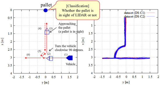 This experiment evaluated the classification accuracy of the proposed method compared to the conventional method, which only uses range data, in the case of similar trajectories. The proposed method classifies the existence of a pallet. If the pallet is in sight of the LIDAR, the classification result becomes true. Therefore, if the pallet is out of sight, the result becomes false. Figure 11 (left) presents an overview of the trajectories. Initially, the vehicle equipped with the SPAD LIDAR moved in a straight line (see (1) in Figure 11). At this time, the pallet was out of sight of the SPAD LIDAR. Next, the vehicle rotated by 90 in a clockwise direction (see (2) in Figure 11) and approached the pallet. The pallet came within sight during the rotation. The vehicle finally approached the pallet. Figure 11 (right) shows the ground truth trajectories. In this experiment, we collected two datasets: “DS C1” and “DS C2”. Each dataset had 10 similar trajectories containing this route.