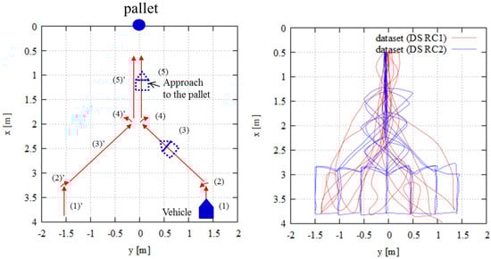 This experiment evaluated the localization and classification accuracy for dissimilar trajectories. We evaluated the basic performance of the DCNN method based on the SPAD LIDAR results obtained in Experiments 1 and 2 in the case of similar trajectories. In a factory scenario, the AGV mostly moves with similar trajectories, but in some cases, the AGV employs dissimilar trajectories. This experiment evaluated the latter scenarios. We collected data for two types of dissimilar trajectories, named “DS RC1” and “DS RC2”. For DS RC1, the vehicle freely approached the pallet (see red line in Figure 13 (right)). For DS RC2, the vehicle moved along a predetermined route (see blue line in Figure 13 (right)). Figure 13 (left) provides an overview of the trajectories in DS RC2. Figure 13 (right) plots the ground truth trajectories in RC1 and RC2.