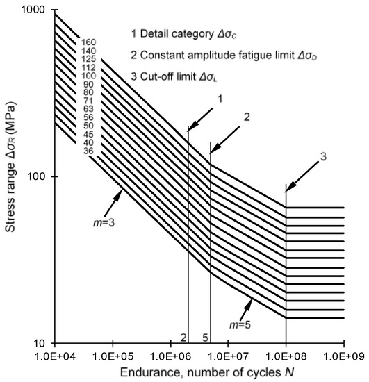 For the nominal stress range spectrum, the fatigue strength curves are expressed as