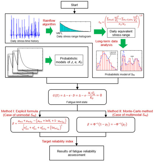 Based on the above formulation, the proposed outline for fatigue reliability assessment based on long-term strain monitoring is summarized and presented in Figure 2.