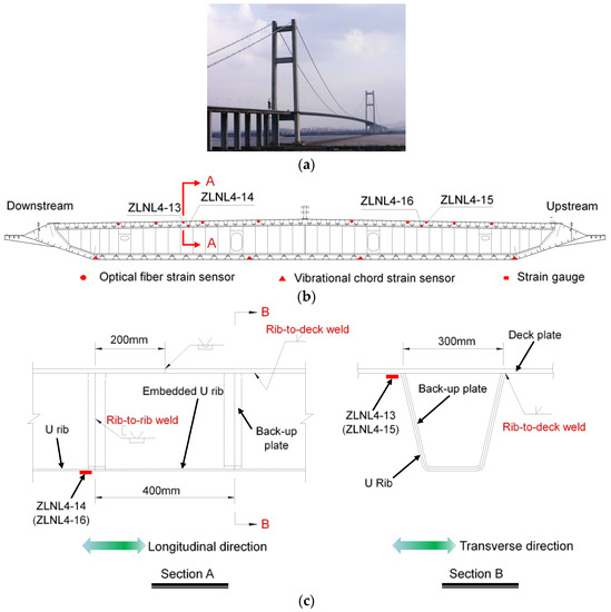 Runyang Suspension Bridge (RSB), open to traffic in April 2005, is a single-span steel suspension bridge, as shown in Figure 3a. It has a main span length of 1490 m. The aerodynamically shaped closed box steel girder is 36.3 m wide and 3.0 m high. The material of the box girder is Q345 steel, with a yield strength of 345 MPa. The health monitoring system for the RSB was developed and installed for real-time monitoring of bridge responses under various environment actions and traffic loads [10]. Three types of strain sensors—i.e., optical fiber strain sensors, vibration chord strain sensors, and strain gauges—were installed on the mid-span section of the RSB’s steel box girder, as shown in Figure 3b.