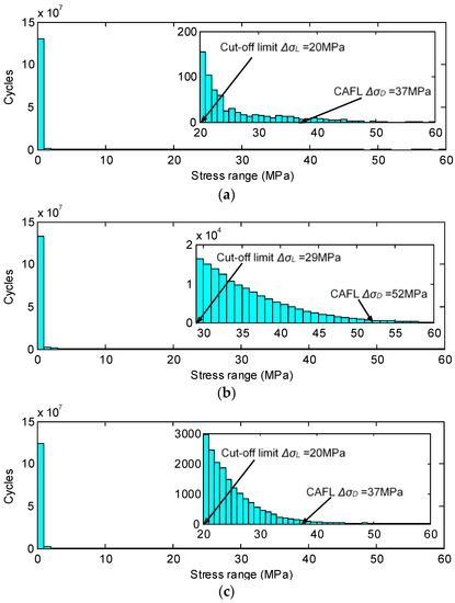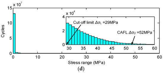 where ΔσR is the stress range; NR is the corresponding life in terms of number of cycles. In this study, the fatigue strength coefficient is defined as KC when ΔσR is larger than ΔσD, and KD when ΔσR is smaller than ΔσD. According to Equation (1a,b), the fatigue damage D induced by stress range S is