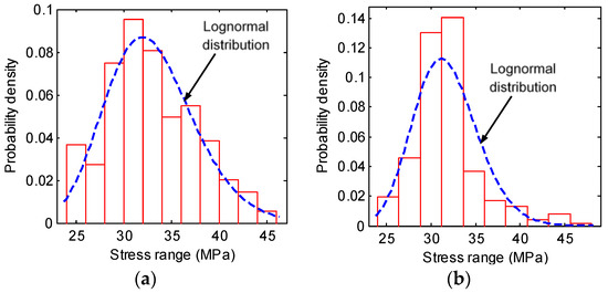 Most studies indicated that the distribution of the Seq from monitoring data by SHMS are unimodal [21,22,23]. However, the authors’ most recent studies based on field measurements demonstrated that the Seq for certain OSD fatigue details is distributed multimodally. Hence, both the lognormal model and Gaussian mixture model (GMM) are employed to account for the actual distribution characteristics of the measured equivalent stress ranges.