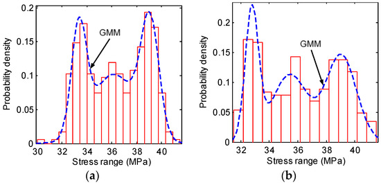 GMM is one of the finite mixture distributions (FMD). The FMD has been used to quantify the uncertainty of the measured stress ranges in fatigue analysis of steel bridges [24,25]. For example, Ni et al. [24] fitted the FMDs to the measured stress range histograms of the Tsing Ma Bridge, in which several peaks are available which can be attributed to the highway traffic, the railway traffic, and the wind excitations [25]. In this study, the GMM is used to quantify the uncertainty of the measured daily equivalent stress ranges rather than the measured stress range histograms.
