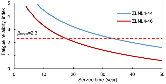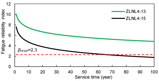 The time-dependent fatigue reliability indices are shown in Figure 8 and Figure 9. It is observed that the reliability indices are pretty high at the beginning of the service life of these welded details. However, as time goes on, the reliability indices decrease significantly. Figure 8 shows that during the first 10 years of the service life, the fatigue reliability indices of the rib-to-rib details cannot be obtained due to the extremely low failure possibility. According to the ISO 2394 [31], the target reliability index for a structural component with certain consequences of failure and moderate costs of safety measures is 2.3. As show in the figures, the service years for details of ZLNL4-14, ZLNL4-15 and ZLNL4-16 are 33, 65, and 18, respectively, when the fatigue reliability indices reach βtarget. Only the welded detail of ZLNL4-13 has fatigue reliability higher than βtarget during the entire 100-year service life. Results also indicate that for both the two types of weld details, the fatigue reliability index of the downstream detail is higher than that of the upstream detail. Besides, the reliability index of the rib-to-deck detail is higher than that of the rib-to-rib detail. The results suggest that during the service life the RSB, there are high levels of fatigue failure for welded details of the orthotropic deck. Hence, routine and in-depth field inspections are required to locate the potential fatigue cracks and make timely mitigation plans.