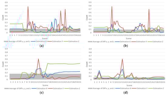 Differences in orientation-based estimation between the traditional method [17] and the proposed method, and the average of cumulative errors in the x, y, and z orientations. (a,c,e,g) and (i) compare the differences in the estimated motion of the x, y, and z orientations using the previous research method. (b,d,f,h,j) showing the differences in the estimation results of these orientations when they are weighted by the proposed algorithm.