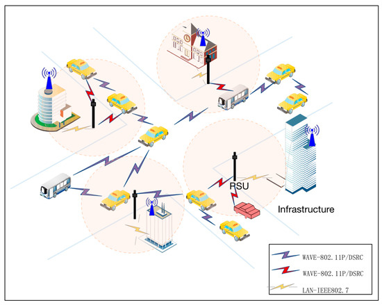 According to a report by the World Health Organization (WHO), the total number of worldwide road traffic deaths caused by various traffic accidents is 1.25 million per year [1]. To manage increasingly heavy traffic scenarios and enhance driving safety, wireless sensor networks and smart devices have recently been implemented on a large scale in the transportation systems of many countries. As part of an intelligent transportation system (ITS), vehicle sensor networks (VSNs) provide a better resolution to traffic problems via the collection, processing and dissemination of traffic information within the scope of interconnected sensor nodes, which are mounted on vehicles and roadsides. The static wireless access nodes alongside the roads, which are called Road Side Units (RSUs), are used to provide communication to vehicles and infrastructure in their coverage area. VSNs involve different network modules, such as Wireless Access in Vehicular Environment (WAVE) [2]/Dedicated Short-Range Communication (DSRC), Wireless Fidelity (Wi-Fi) and the 4th Generation Communication System (4G)/Long Term Evolution (LTE) that work together. Among them, Vehicle-to-Vehicle (V2V) and Vehicle-to-Infrastructure (V2I) communications are two main forms of VSNs that use the DSRC protocol [3] and WAVE to perform their operations in collaboration. VSNs are rapidly changing and self-organizing with multiple-hops topologies over wireless links. Various wireless communication devices on vehicles broadcast traffic information to RSUs or other vehicles every 100–300 milliseconds according to the DSRC. Thus, it must take a short amount of time to deal with a message without delay for VSN entities.