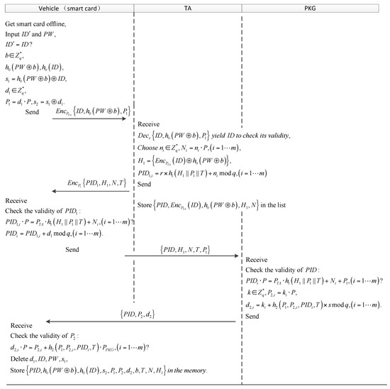 Upon receiving the register request, the TA decrypts it using the TA’s private key and checks whether the is legal, and if so, the TA will make pseudo identities for the user. The TA computes: