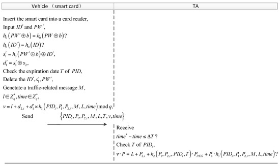 When receives , the smart card decrypts and checks them via running . If the equations hold, which mean that adversaries do not tamper the pseudo identities, and the smart card calculates . Otherwise, reject the . Here, every . is generated as a combination of secret value of the TA and the user-chosen secret. Thus, adversaries cannot forge the valid without the user-chosen secret . Subsequently, the smart card sends the tuples to the PKG through a public channel.