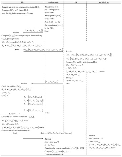 Upon receiving the signed message, the nearby anchor nodes perform the different steps inside their range, which firstly check the list and if there is no short-term pairwise encryption key with the RSU, the nodes calculate the via . Furthermore, the anchor nodes recount their coordinates according to and compare with previous ones. If the value significantly changes, then the RSU is abnormal, which is forged by the adversaries, and the anchor node generates an alert that is sent to the PKG. To prevent location information tampering attacks by adversaries, the anchor node encrypts its location using and broadcasts to RSUs next time.