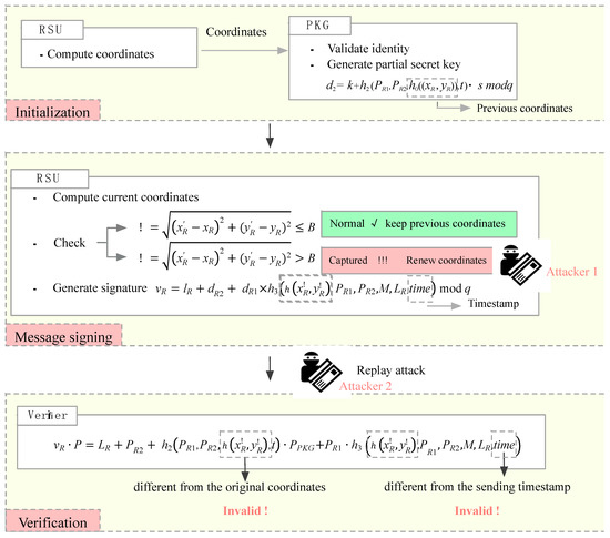 Furthermore, every signature including a timestamp is to record the current sending time of the signer. Verifiers can check out the replay attack easily by validating the freshness of receiving . If , in which indicates the valid time interval, the verifier will reject the signature. Figure 7 shows the function of the coordinates and the timestamp included in the signature.