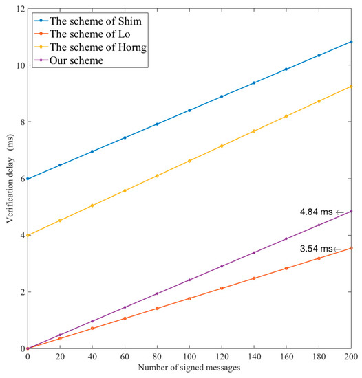 Figure 8 shows the relationship between the density of signing messages at a VSN entity inside its wireless range and the verification delay. The verification delay of the proposed scheme, which is 6.5 μs for one message, is slightly longer than the one in Lo’s scheme. However, the difference is small, and the safety of our scheme is enhanced largely.
