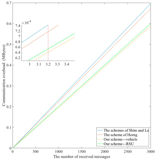 The communication overhead of proposed scheme is about 296 bytes and 300 bytes for a vehicle and a RSU respectively. To reduce the communication overhead, the key point in the proposed scheme is how to reduce the costs of the elements in . Shim [22] developed a method, which can reduce the size of a point in . In this method, the entity (RSU or vehicle) only sends the x-coordinate of the point, and the receiver can acquire the y-coordinate by calculating the square root. Therefore, the size of the is reduced by applying this method, and in our scheme, the total communication overhead for a vehicle is about 256 + 256 + 256 + 256 + 256 + 256 + 32 + 32 = 1600 bits = 200 bytes, and for a RSU is about 32 + 256 + 256 + 256 + 256 + 256 + 256 + 32 + 32 = 1632 bits = 204 bytes. Therefore, the proposed method obtains the smallest communication overhead compared with the other three schemes.