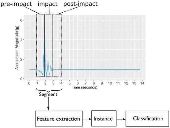 Ojetola [18] provides a method that uses FOSW to segment the data stream. He implemented a 12-s sliding window with an overlap of , where N is the total number of samples in the window, and used a decision tree as the classifier. To improve the classifier’s detection rate, fall stages (pre-impact, impact, and post-impact) were aligned to each segment as a basis for feature extraction. During the pre-impact stage, acceleration drops below 1 g since the subject is (briefly) in free fall after losing balance. The impact stage of the fall coincides with one or more high peaks in the accelerometer measurements. The highest peak during the impact stage is generally taken to be the moment when the body hits the floor. The post-impact stage is characterized by inactivity corresponding to reduced variation in the accelerometer reading. For an experimental, laboratory-based dataset, this approach achieves a precision, recall, and F-score of 93.5%, 94%, and 93.2%, respectively. Notably, both precision and recall are high.