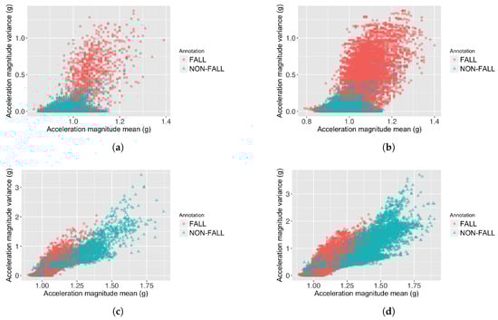 This study uses two large publicly accessible datasets with a relatively wide range of activities and falls, so that all techniques are fairly compared. An important finding of the classifier performance (shown in Table 5) is that increasing the window overlap in continuous feature extraction FOSW can cause the precision to reduce, because the number of data overlaps between fall and non-fall samples is increased on both datasets. This data overlap phenomena is shown in Figure 3. This means that using an FOSW with a high overlap (e.g., micro-annotation-based machine learning approach from Ojetola et al. [18]) is not effective in increasing the classifier’s overall performance (F-score).