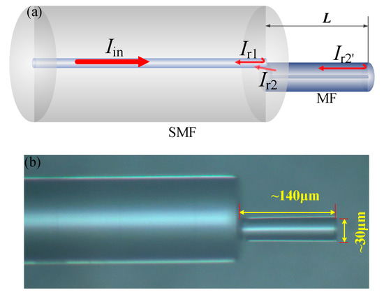 The structure of the tip-FPI is schematically shown in Figure 1a. A portion of the incident light is reflected back to the core (Ιr1) when the light is launched into the SMF, due to the reflection from the SMF-air interface. The rest of the incident light is coupled to the MF and reflected back at the end of the MF (Ιr2′), due to the Fresnel reflection from the MF-air interface. At the junction, a part of the light (Ιr2) is coupled back into the guided core mode of the SMF. As a result, two beams of light (Ir1 and Ιr2) interfere. At the same time, there is a part of Ιr2′ that is repeatedly reflected and coupled back into the SMF core. However, this part of energy is much lower than the first reflection. Therefore, only the first reflection process at the MF-air interface is considered in this paper. The top view of the fabricated device captured by optical microscope is shown in Figure 1b.