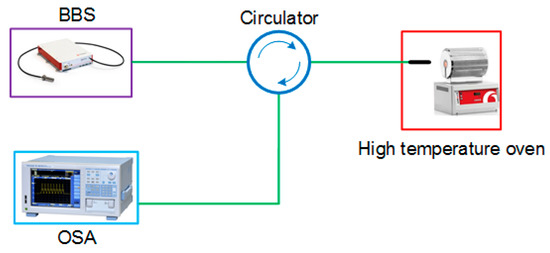 The experimental setup, as shown in Figure 2, consisted of a broadband optical source (Fianium, NKT Photonics, Southampton, UK), an optical fiber circulator, and an optical spectrum analyzer (AQ6370, YOKOGAWA, Kanazawa, Japan) with a resolution of 0.02 nm, which was used to measure the reflection spectral response of the tip-FPI. The tip-FPI was placed horizontally in the high-temperature oven (Carbolite Gero, Sheffield, UK). The reflection spectrum of the tip-FPI with a length of 60 μm is shown in Figure 3a. A fast Fourier transform (FFT) was performed to provide a deep insight into the frequency components, as shown in Figure 3b. Multiple peaks indicate multiple reflections from the MF-air interface. It is clear to see that the power of the reflected light was mainly concentrated in the lowest frequency component (for example A), and that of the high-frequency ones (for example B and C) quickly decrease with the increase of frequency. Obviously, the power at the lowest frequency component, mainly resulting from the first reflection, is dominant, and the high-frequency ones induced by multiple reflections are very small, such that they can be neglected for the purposes of this experiment.