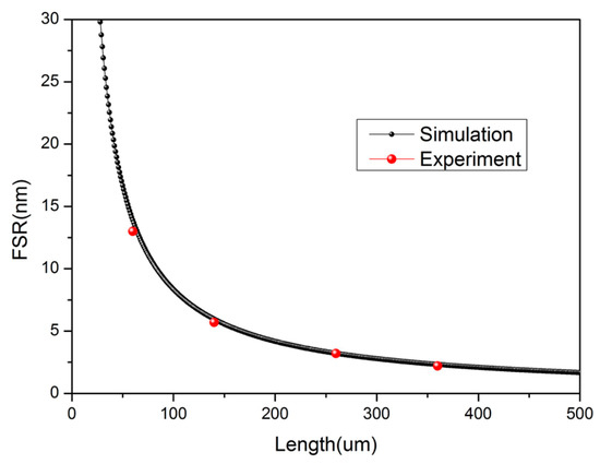 From the analysis above, we can see that the FSR is related to the nMF and L of the cavity. Considering the material of the MF is almost the same as the SMF, we took the value of 1.44 as the RI of a MF at 1550 nm. The calculated relationship between the FSR and L is shown in Figure 4. Observing the experimental spectrum in Figure 3, the value of the FSR is 13.12 nm. This implies that the L is 63.6 μm, which is very close to the direct measurement result of 60 μm obtained from the microscope image. Some other experimental results are also consistent with the theoretical results, and are shown as red balls in Figure 4.