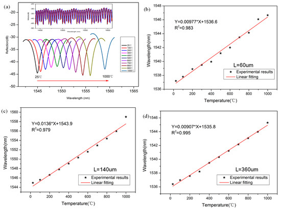 (a) Shift of reflection spectrum with temperature (L = 140 μm); the wavelength-temperature relationship and their linear fitting (b) L = 60 μm; (c) L = 140 μm and (d) L = 360 μm.