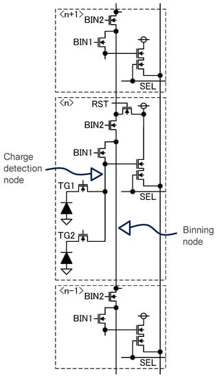 The developed 3.0 μm pixel configuration is shown in Figure 1. The pixel has a two row-shared structure. Through switches, BIN1 and BIN2, the charge detection node is vertically connected. These binning switches act as vertical binning switches. To prevent extra parasitic capacitance when high pixel gain is required, the charge detection node is isolated from the vertical binning node by the BIN1 switch.