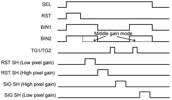 To obtain a linearized high dynamic range signal, the same photodiode signal is read out twice with different pixel gains. Figure 2 shows a pixel operation timing for the dual pixel gain readout. Firstly, RST, BIN1 and BIN2 switches are all turned on to initialize voltage of the vertical binning node and the charge detection node. After the RST switch is turned off, a low pixel gain (LPG) offset signal is sampled as RST SH (Low pixel gain). Next, BIN1 and BIN2 switches are turned off, and high pixel gain (HPG) offset, RST (High pixel gain) is sampled. A first charge transfer pulse is applied on the transfer gate, TG; then, the HPG signal, SIG SH (High pixel gain) is sampled. LPG signal is obtained after BIN1 and BIN2 are turned on again, and sampled as SIG SH (Low pixel gain). Before the LPG signal readout, the second transfer pulse is applied to the TG gate so that remaining charge in the photodiode is transferred to the charge detection node in case of high light conditions. When BIN1 and BIN2 switches are turned on again, offset charge in the charge detection node is re-combined to the same condition as the RST SH (Low pixel gain); therefore, correlated double sampling (CDS) is realized for LPG signal readout as well as the HPG. When the BIN2 switch is turned off (dotted line in Figure 2) during the signal readout period, the pixel operates in the middle pixel gain (MPG) condition.