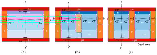 Equation (1) suggests that the Wd (fully depleted region) becomes narrower in the presented structure in Figure 3b due to the additional P-type layer between the split PPDs. Thus, the Vpin to fully deplete the PPD can be lower than for the conventional structure shown in Figure 3a, even with the same N dopant, Nd. This means that the proposed structure allows Nd to be increased in order to boost LFWC with the same Vpin as that of the conventional PPD.