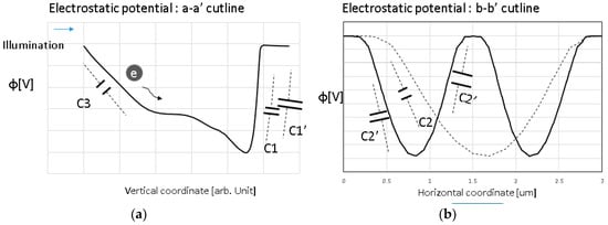 Figure 4 shows an example of electrostatic potential profiles with capacitance components along the lines of Figure 4a a-a’ and Figure 4b b-b’ in Figure 3a for both the conventional PPD and the presented one. In the simple P+/N step junction model, the depletion layer width Wd in PPD is expressed as Equation (1), where ε is the semiconductor dielectric constant, Vpin the pinning voltage when the PPD is fully depleted, Nd the N dopant concertation, and φbi the built-in potential.