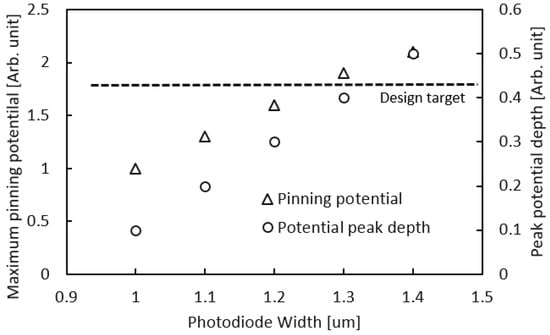 Figure 5 shows the PPD width dependence of the pinned potential and the peak potential depth, as obtained by a 2D device simulation. The results show that the location of the potential peak shifts deeper and the peak potential increases as the PPD width is increased. This suggests that it is difficult to boost LFWC with a large PPD by increasing the N dopant without changing Vpin or supplying voltage. This is a benefit of the presented PPD structure, which only uses a narrow PPD width.