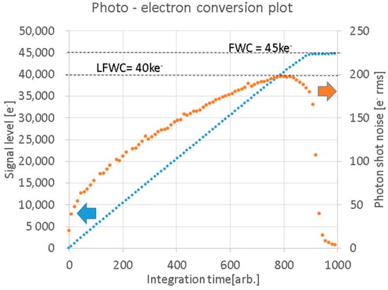 A photo-electron conversion plot for this pixel is shown in Figure 6. A linear full well capacity (LFWC) of 40 ke− and a full well capacity (FWC) of 45 ke− were obtained with good linearity. In this paper, LFWC is defined as signal electrons measured at the shot noise peak point. Above LFWC, random noise decreases because of pixel saturation. Also, FWC is defined as signal electrons corresponding to PD saturation.