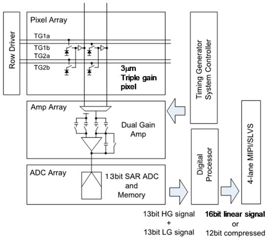 The basis of the dynamic range enhancement introduced in this image sensor is a dual gain readout scheme [15], and follows the following sequence: (1) a photodiode signal is read out in a high gain mode, and (2) read out in a low gain mode; then, (3) the two signals are merged into a high dynamic range linear signal. The intra-scene dynamic range in this scheme is defined as the ratio between linear full well (LFW) to readout noise in the high gain condition. Therefore, increase of the LFW and reduction of readout noise floor are required to increase dynamic range.