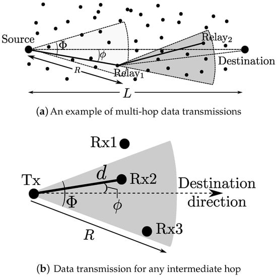 Stochastic geometry is a powerful tool to model and analyze wireless networks assuming that the locations of nodes or the network structure are random in nature because of their unpredictable spatial characteristics [32]. Poisson point process (PPP), where the number of points (nodes) inside any compact set is a Poisson random variable and the points are uniformly distributed in the compact set, is the most widely used spatial model for networks with uniform node density such as ad hoc networks [33,34,35,36,37] and cellular networks [38]. For this reason, we also assume PPP for the spatial distribution of MTC devices. To be specific, we consider a multi-hop M2M network using mm-wave as shown in Figure 1a, where nodes (devices), which are indicated by the black dots, are uniformly scattered according to a two-dimensional of intensity .