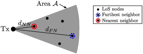 where is the blockage parameter that depends on the density and sizes of obstacles blocking LoS paths from the transmitting node to Node i. As in [29,44,45,46,47], we assume that an outage occurs if the LoS path is blocked. In other words, even if Node i is within the transmission area , the link to Node i is unavailable with the probability of .