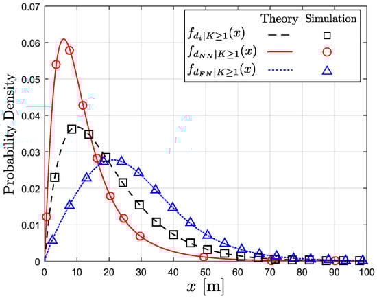 Figure 3 shows the conditional PDFs in Equations (9), (14), and (17) with , , m, , and . In the figure, the analytical curves are consistent with the simulation results. The simulation curves are obtained from iterations with random topology. In each random topology realization, the nodes are randomly and uniformly distributed over 1 km2 square area, where the number of nodes follows Poisson distribution with the density of nodes/m2. With trials, the empirical PDFs of , , and are obtained.