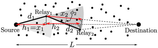 Because the actual route is a squiggly line between the source and the destination, this approximation is in fact the lower bound on the actual end-to-end hop count as shown in the example case in Figure 4. Let H be the hop distance D projected onto the direction from “the source” to the destination. In the figure, the progress in the second hop projected onto the transmitter (Relay1)-Destination axis is greater than the progress along the source-destination axis, . Thus, in general, , which gives for . However, as indicated in [13], for a enough large L, for most of hops i because the angle between the two axes “Relayi-Destination” and “Source-Destination” is almost zero, which makes the proposed approximation in Equation (20) becomes tighter.