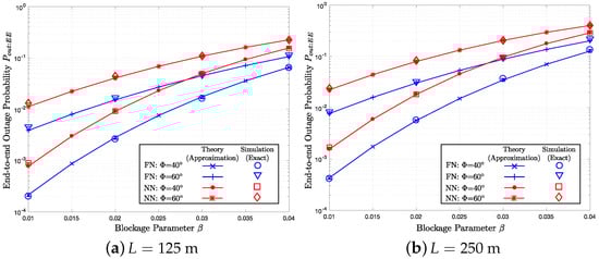 In this section, we validate the analytical results and test the tightness of the end-to-end performance estimation based on per-hop statistics by comparing with simulation results. We assume to model the LoS channel. In addition, we set m, which corresponds to the transmission range for the omni-directional antenna . In other words, the beamwidth is , and the maximum possible per-hop transmission range is m assuming battery-powered devices with limited transmission range. Of course, this value of can be changed depending on the system parameters and applications. As the beamwidth becomes narrower, the transmission range R increases based on Equation (2). The simulation results are averaged over iterations with random topology. In each trial, the locations of nodes are uniformly distributed over a 1 km2 square region, where the number of nodes follows Poisson distribution with nodes/m2. For a given L, the source is located at the center of the 1 km2 space. In each hop, the next-hop node is selected following FN or NN. We declare an end-to-end outage of a trial, if an outage occurs in any intermediate hop.