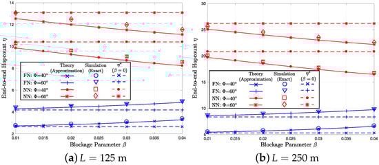 Figure 6a,b display the average end-to-end hop count versus graphs. First, FN shows significantly smaller compared to NN. When , both the theory and simulation curves are close to the blockage-free graphs . As increases, of FN increases due to less likelihood to find far-distance nodes. On the other hand, the NN shows the opposite trend because of the lower effective density of the LoS nodes in (less candidates), which results in less chance to find a LoS node with a short hop distance. Hence, the gap between the two routing strategies become smaller, as increases.