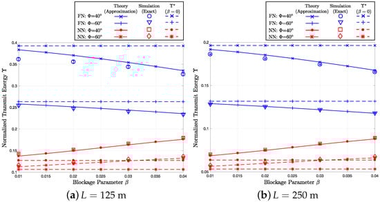 Assuming the end-to-end distance L of 125 m, Figure 5a, Figure 6a and Figure 7a show how the end-to-end outage probability , the average end-to-end hop count , and the total transmit (radiated) energy consumption change, respectively, as the blockage parameter varies over . In the figures, we compare the theoretical results (i.e., the approximation proposed in Section 5) with the end-to-end simulation (exact) results for and , which give the transmission ranges of m and m, respectively. In the three figures, the solid lines with the ‘x’- and ‘+’-markers represent the furthest neighbor (FN) routing with and , respectively. On the other hand, the solid lines with the dot and asterisk markers indicate the nearest neighbor (NN) routing with and , respectively. The circles, triangles, squares, and diamonds correspond to the end-to-end simulation results for FN with , FN with , NN with , and NN with , respectively. Moreover, the “I-shape” error bars overlaid on the simulation markers indicate 95% confidence intervals computed using Greenwood’s formula [57]. In Figure 6a and Figure 7a, the baseline cases with , which are indicated by the dotted lines, are illustrated to highlight the impact of the blockage effects. In Figure 5b, Figure 6b and Figure 7b, we perform the same set of simulations for a different end-to-end separation m and compare the results with the numerical calculations based on the per-hop statistics. To quantify the impact of the blockage on three different performance metrics, the baseline cases without blockage are provided in Table 1, Table 2 and Table 3.