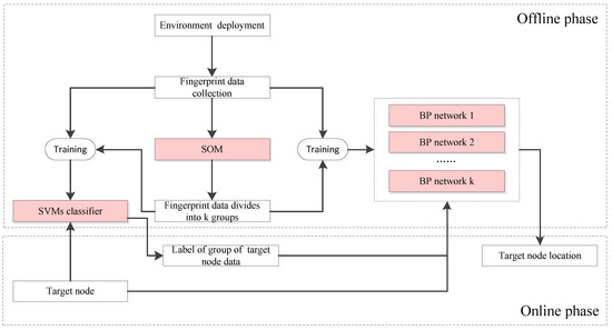 The localization process of Plils consists of two phases; the off-line training phase and the online localization phase. As shown in Figure 3, the whole process adopts three algorithms, i.e., the SOM, SVM, and BP algorithms. Specifically, SOM belongs to an unsupervised learning model, and runs in the offline training phase to categorize the whole radio map into k subregions by clustering the fingerprints at all grid center points, while SVM and BP belong to supervised learning models, and span both the off-line training and the online localization phases. SVM regards the k subregions obtained by SOM as its training examples, and decides which subregion a target node is located in, while BP utilizes each subregion to train the neural network, and eventually establishes k learning models. Let us suppose the subgroup number of the target node is ; the ith learning model of BP will be carried out to predict its current location of its target node according to its MRPL vector. Here, k is the system parameter and needs to be prespecified in advance. The way to determine the value of k is discussed in Section 5.