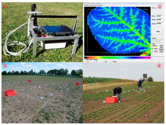 The field chlorophyll fluorescnce sensor WEED-PAM®. ① A picture of the sensor. It consists of the camera control unit and the computer including software; ② The software interface when measuring a herbicide treated leaf of soybean. The purple and blue pixels represent leaf area with higher Fv/Fm values, while the red pixels represent leaf area with lower Fv/Fm values. Blue color represents high Fv/Fm values and healthy tissues while the yellow and red color represents pixels with low Fv/Fm values and plant damage; ③ Dark adaption cover box distribution when conducting the first measurement at the one-leaf stage of soybeans at site Böblingen; ④ Measurement at the two-leaf stage of the soybeans at site Nürtingen.