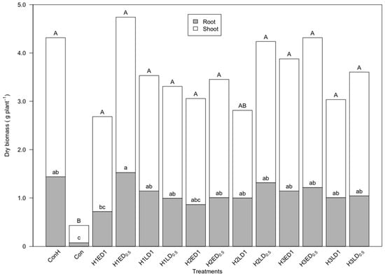 The root and shoot dry biomass per soybean plant on 67 days after sowing. H1, herbicide combination 1; H2, herbicide combination 2; H3, herbicide combination 3; E, early application; L, late application; D1, recommended dosage; D0.5, half recommended dosage; significant differences between mean values for the root and the shoot independently are indicated by different letters (Tukey’s HSD Test, p < 0.05).