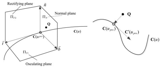 In the left picture of Figure 2, vectors , , are respectively the principal normal vector, the tangent vector, and the binormal vector of curve at point , and plans , , are the corresponding osculating plane, normal plane and rectifying plane. By our definition of as a point on curve closest to the given point , has to be in the curve’s normal plane at . Thereout, an objective function is given as follows to calculate the projection point on curve :