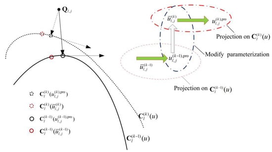 In the kth iteration of the iterative projection optimization procedure, projection parameters gained from the (k − 1)th iteration are used to modify the previous parameterization in order to optimize the fitted curve. The projection point is calculated using Newton iteration approach presented in Section 2.3.1, with previous parameterization result used as the initial value. For example, in Figure 4, is the fitted curve of the (k − 1)th iteration, is the corresponding parameterization result of point , when do point projection from to , parameter is used as the initial value, and the resulting projection parameter is . In the kth iteration, projection parameter is used to update the parameterization, after which corresponding parameter of point is modified to , and the fitted curve is updated to . When projecting to , becomes the initial value.
