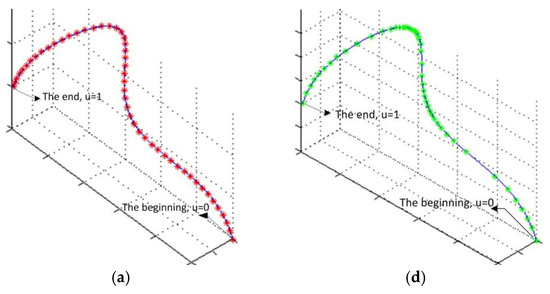 - Determination of knot vector. After the parameterization of data points, knot vector is initialized based on the parameterization result , as follows:where is the number of control points, is equivalent to and is the maximum positive integer that is less than or equal to . In this way, at least one parameter is guaranteed in every knot interval, which assures related matrix is well-conditioned.