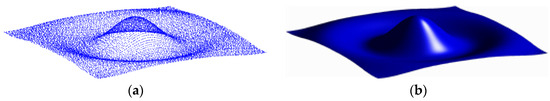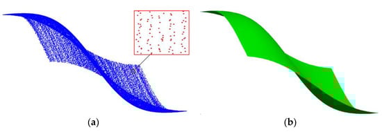 For this non-zero genus surface, method for grid data is applied on a set of grid points, and the proposed method is carried out on 8725 points chosen randomly from the grid data. For the former one, the average error, the maximum error and the time cost are , and 3.8 min successively. And for the scattered data, an average error of is obtained in 5.2 min, where a (4, 4) order NURBS surface with control points is accepted as the final resulting surface, the maximum error of which is . Figure 9 provides the randomly chosen data and the fitted surface.