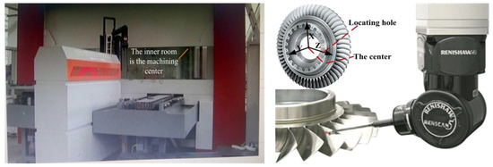 The measuring machine system consists of six relative motion parts, as a result, six coordinate systems from the tip center to the machine zero position are established based on the quasi-rigid-body model for building the machine coordinate system. The workpiece coordinate system is established based on the center circle of the blisk and the locating hole, as shown in the right picture of the Figure 11. The center of the circle is used as the original point of the coordinate system. The Z-axis of the coordinate system is determined by the line that connects the centers of the circle and the locating hole. The Y-axis is determined by the vertical axis of the center circle, and then X-axis is determined by the cross product of Y-axis and Z-axis.