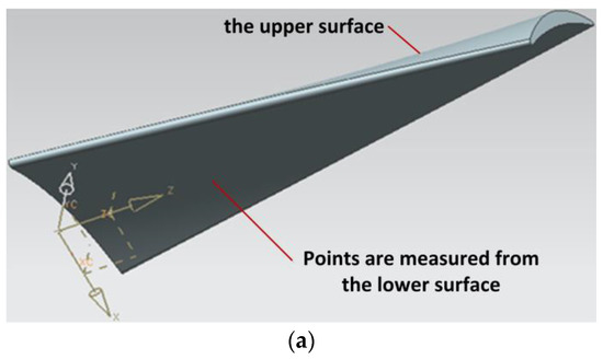 A blade surface. In this example, data points are measured from a blade of aircraft engine by an in-situ automatic measuring machine system [46]. The left picture of Figure 11 is the scene photo (The inner room is the machining center). When the machining of one blade of the blisk is finished, the measuring machine rotates into the machining center to do measurement of the machined blade just like what is shown in right picture of Figure 11. The applied measuring probe is RSP2 probe, and it is installed on the Renscan5TM probe body. The maximum permissible error value of REVO system is no more than 1 μm, and the uncertainty of the whole measuring system is less than (10 + L/30) μm (where L is the length value of the measured object, L: mm).